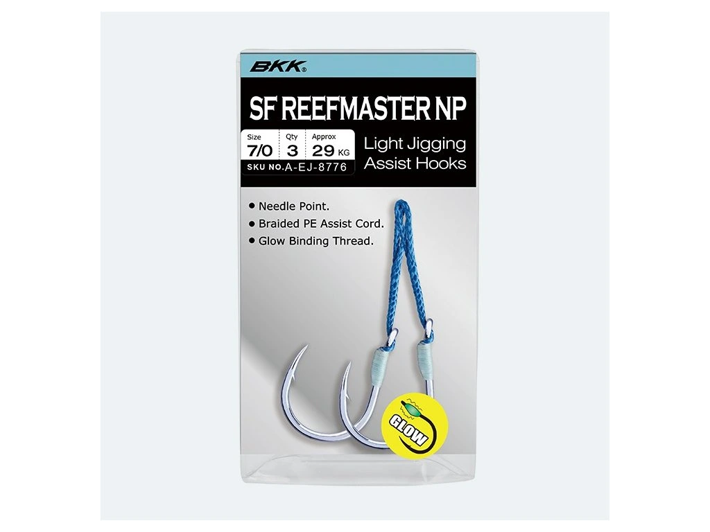 Koncept jigovacích assist háčků BKK SF Reef Master NP je vyvinut tak, aby rybáři měli k dispozici produkt, který mohou použít okamžitě po vybalení z krabičky. To vše s vysokým poměrem cena/výkon. Tyto assist hooky jsou navázané na vysoce kvalitní šnůře z 16 vláken, které jsou spleteny tak, aby měly požadovanou sílu a ohebnost. Svítící korálek na háčku povzbuzuje atraktivitu nástrahy a zvyšuje počet záběrů i ve snížených světelných podmínkách. Samotný háček v sobě má nejpokročilejší BKK technologie včetně Hand Ground hrotu háčku, speciálního kroužku a na povrchu háčku je nereznoucí lesklé cínové potažení.